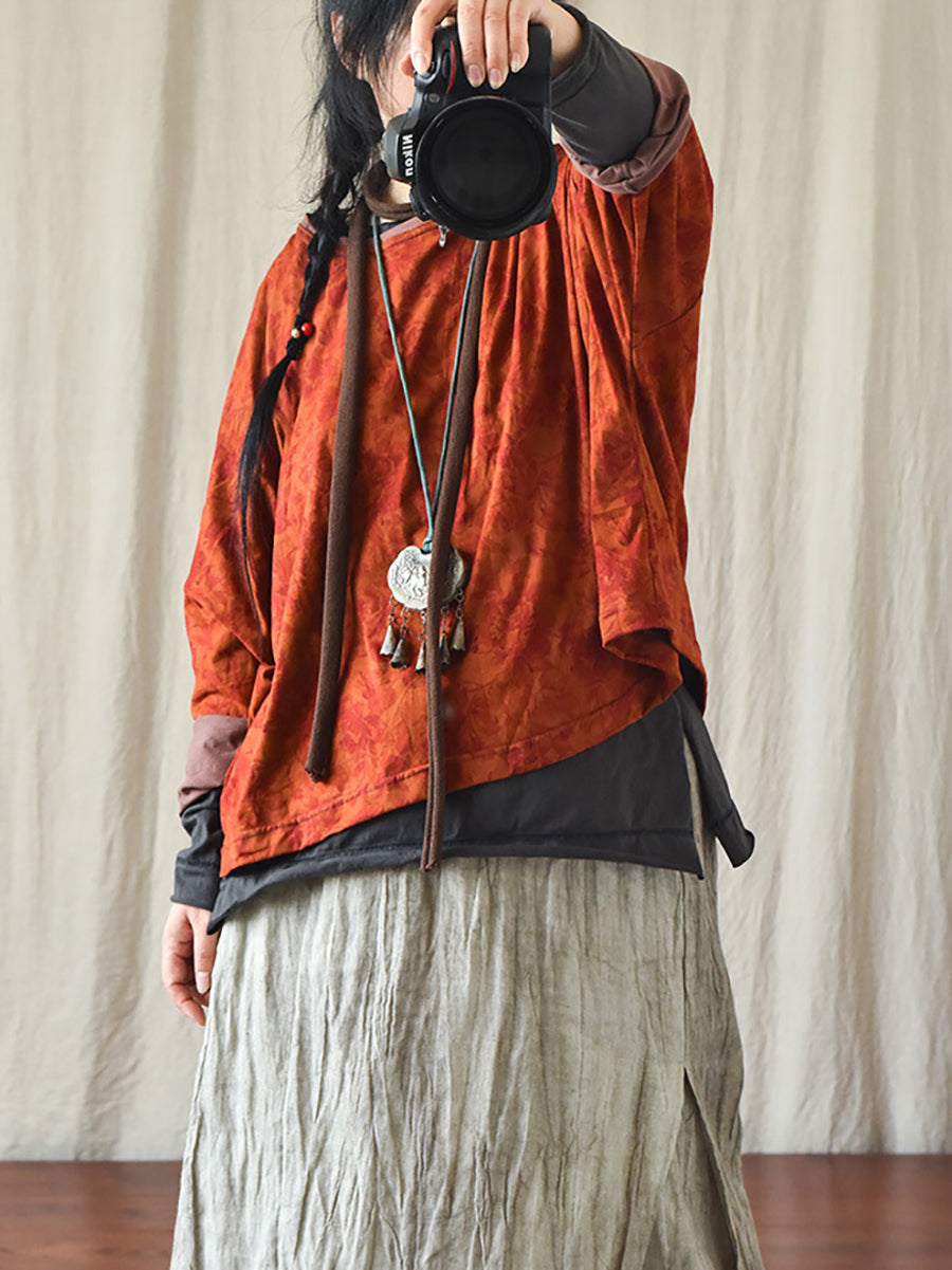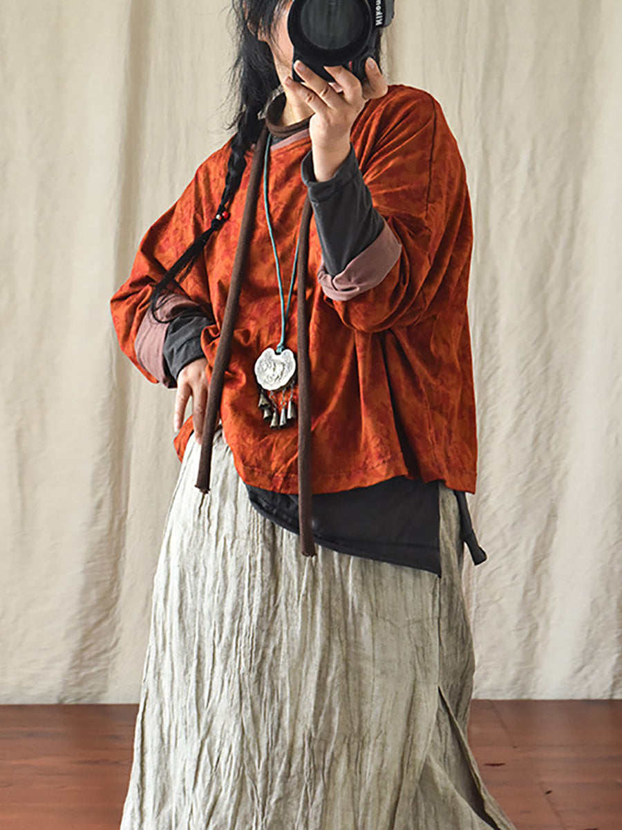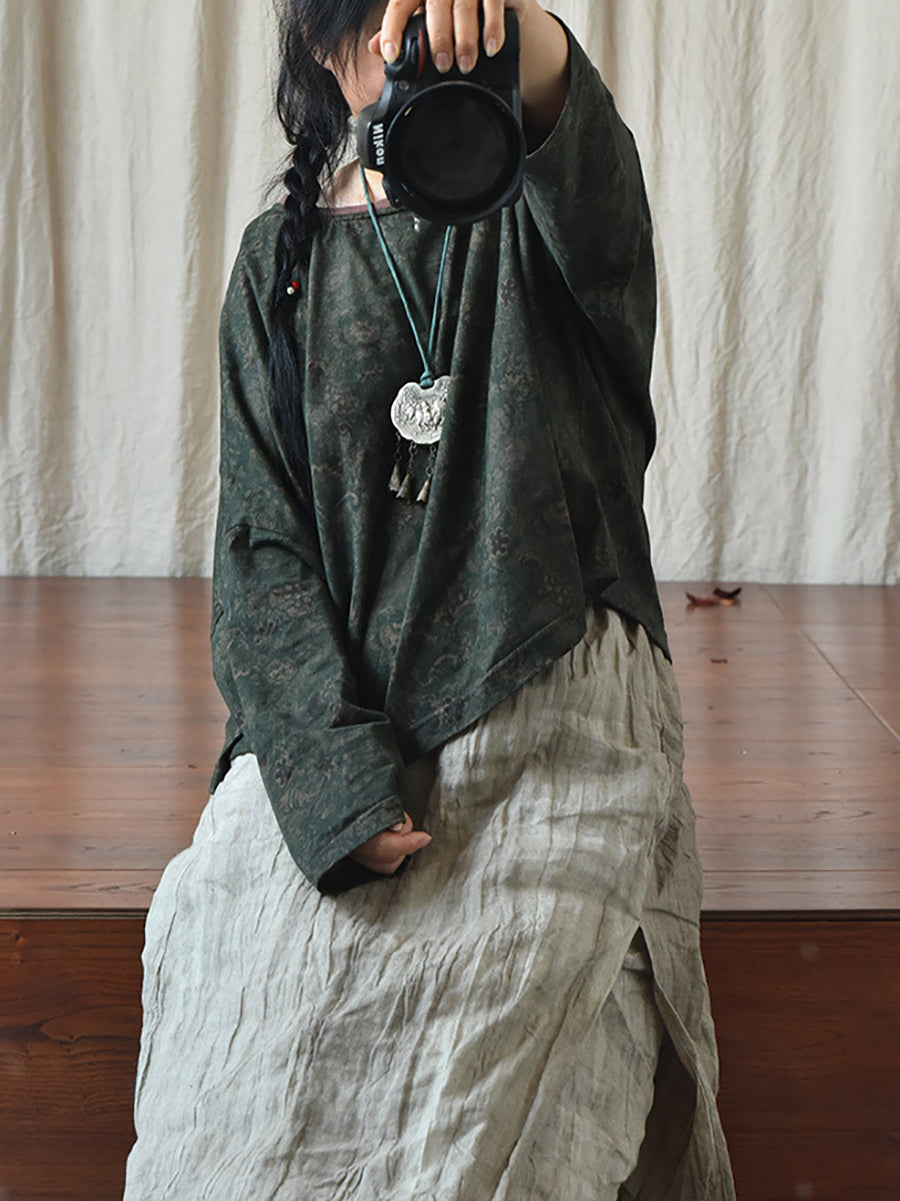Women Vintage Flower O-Neck Loose Cotton Linen Blouse AS1009