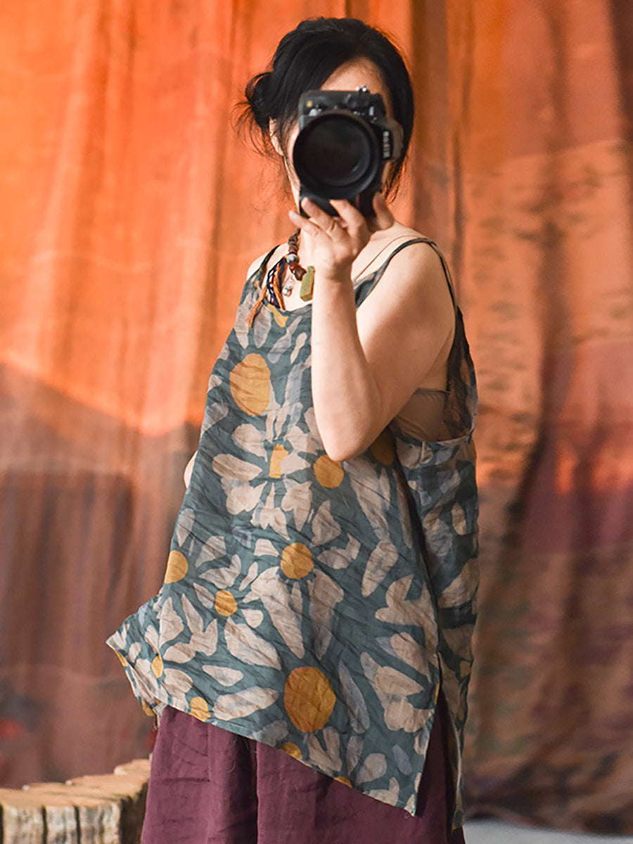 Women Vintage Flower Split Hem Thin Summer Ramie Vest HH051