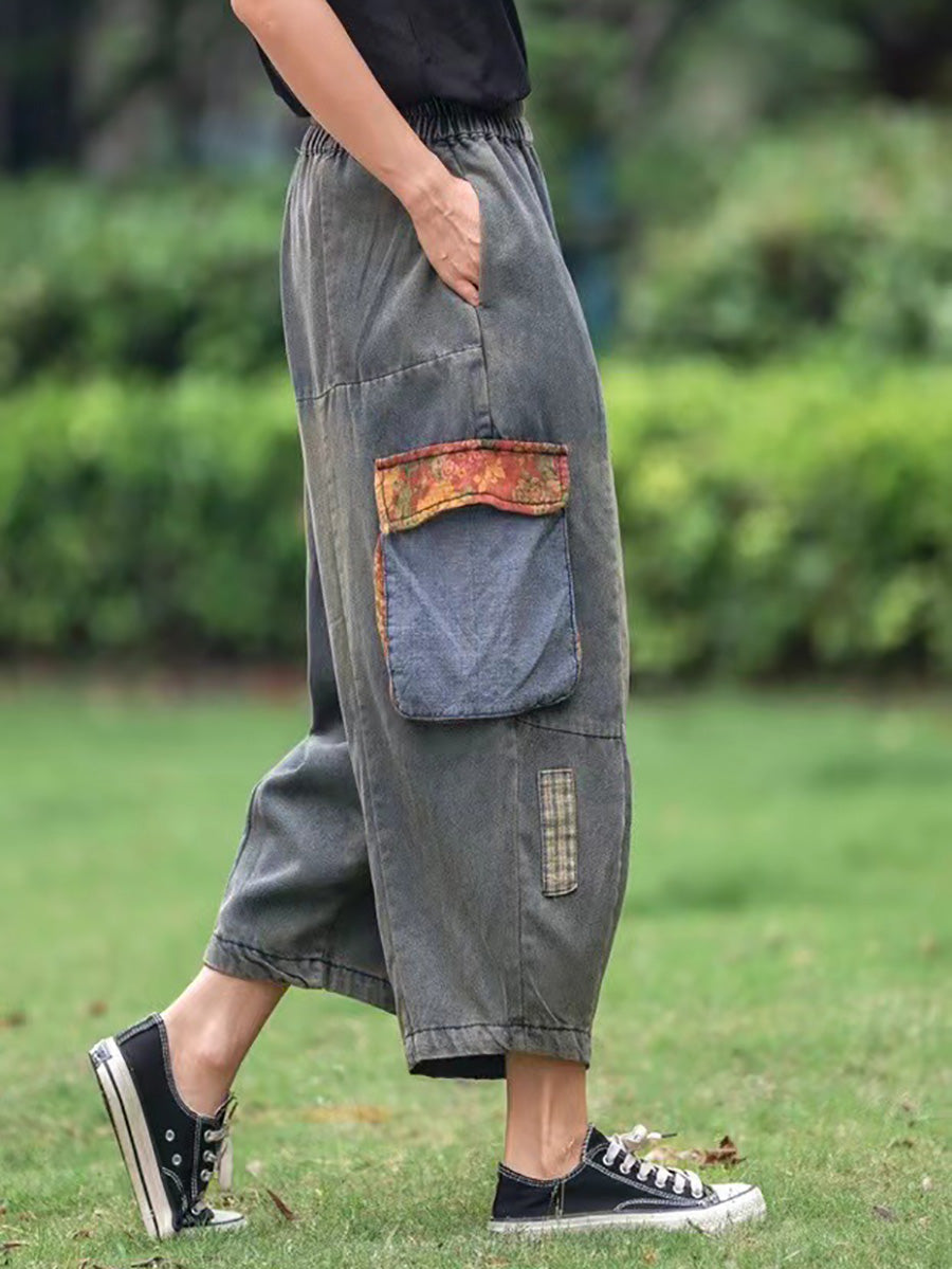 Women Vintage Patch Spliced Denim Harem Pants HH006