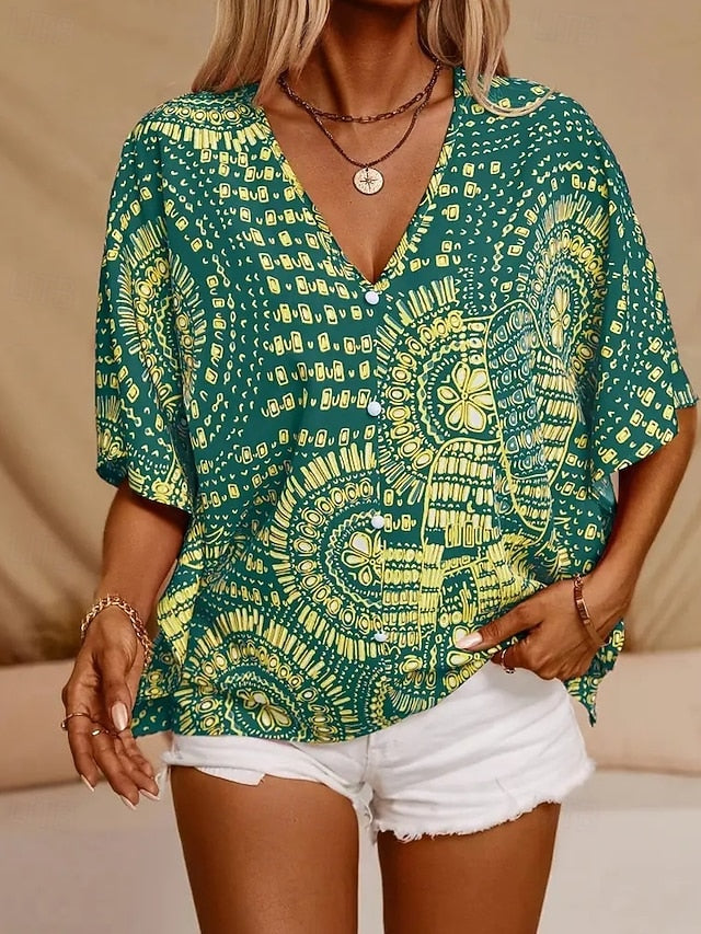 Fabric: Polyester, Tops Type: Blouse, Gender: Women's, Design: Print, Occasion: Going out, Daily, Holiday, Style: Vintage, Bohemia, Stylish, Fit Type: Regular Fit, Neckline: V Neck, Sleeve Length: Short Sleeve, Look After Me: Washable, Hand wash, Machine wash, Top Length: Regular Tops, Pattern: Floral, Season: Summer, Spring,