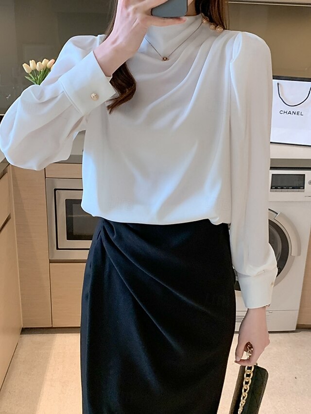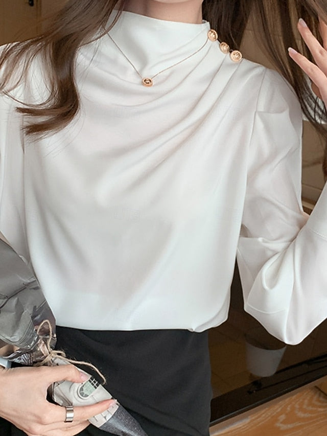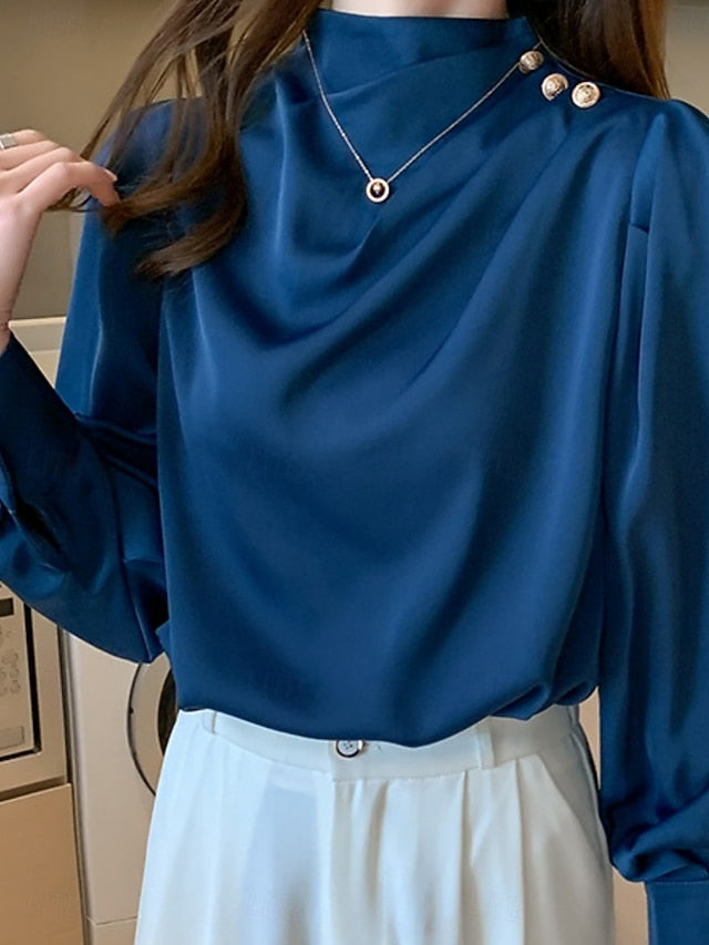 Fabric: Satin, Tops Type: Silky Tops, Satin Top, Dressy, Elegant, Shirt, Blouse, Gender: Women's, Design: Buttons, Occasion: Formal Wear, Work, Style: Modern, Business, Casual, Fit Type: Regular Fit, Neckline: Turtleneck, Sleeve Length: Long Sleeve, Elasticity: Micro-elastic, Look After Me: Hand wash, Machine wash, Top Length: Regular Tops, Pattern: Solid Color, Season: Summer, Spring,
