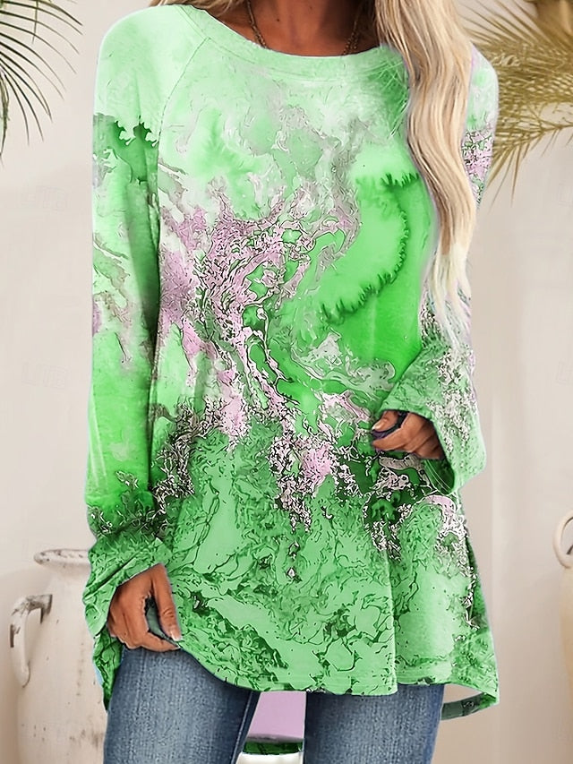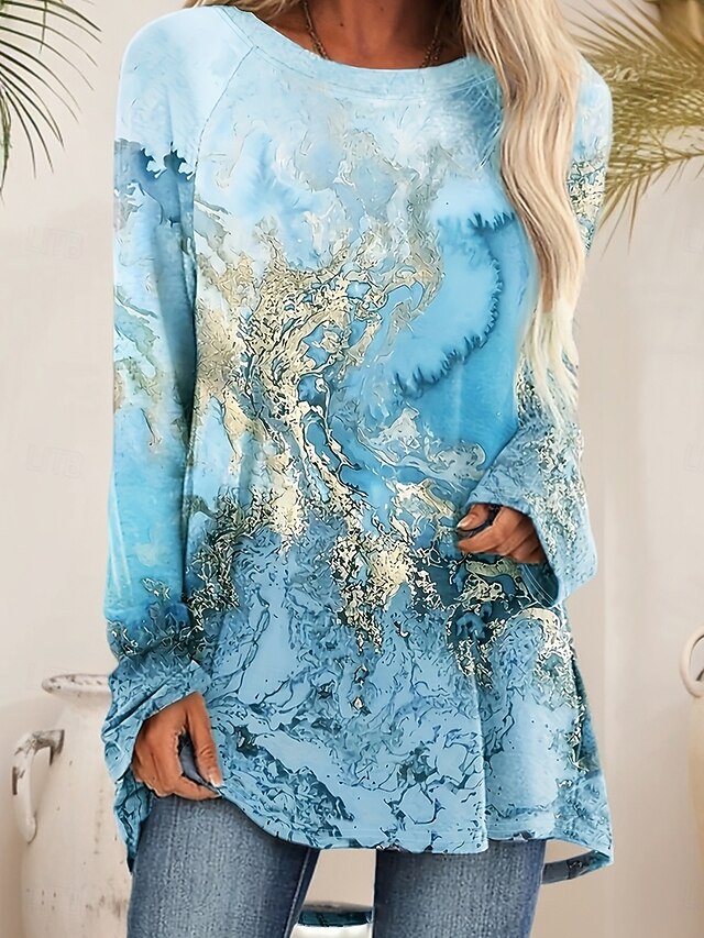 Fabric: Polyester, Tops Type: T Shirt, Gender: Women's, Design: Print, Occasion: Daily, Style: Stylish, Casual, Vintage, Category: T-shirt, Fit Type: Loose Fit, Neckline: Crew Neck, Sleeve Length: Long Sleeve, Elasticity: Stretchy, Look After Me: Wet and Dry Cleaning, Washable, Hand wash, Machine wash, Top Length: Long Tops, Pattern: Graphic, Geometry, Season: Fall, Winter,