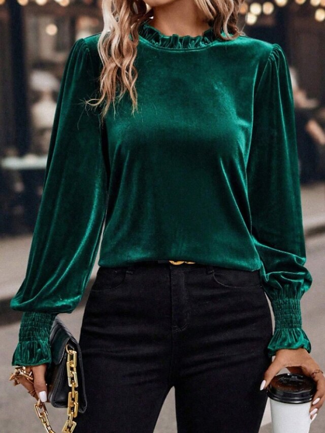 Fabric: Spandex, Polyester, Tops Type: Dressy, Elegant, Velvet, Blouse, Gender: Women's, Design: Ruched, Occasion: Going out, Daily, Holiday, Style: Vintage, Stylish, Fit Type: Regular Fit, Neckline: Crew Neck, Sleeve Length: Long Sleeve, Elasticity: Stretchy, Look After Me: Hand wash, Machine wash, Top Length: Regular Tops, Pattern: Plain, Season: Winter, Fall,