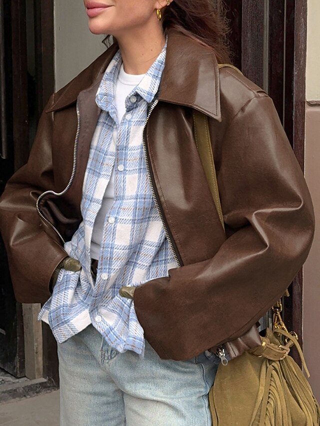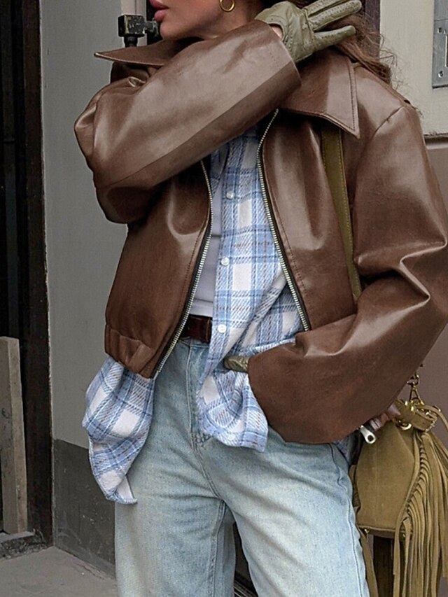 Gender: Women's, Outerwear Type: Faux Leather Jacket, Occasion: Weekend, Going out, Casual, Vacation, Season: Winter, Fall, Function: Comfortable, Warm, Fabric: Faux Leather, Style: Casual, Vintage, Outerwear Length: Regular, Pattern: Plain, Design: Zipper, Pocket, Neckline: Turndown, Sleeve Length: Long Sleeve, Fit Type: Regular Fit, Loose Fit, Elasticity: Micro-elastic, Inelastic, Look After Me: Machine wash,